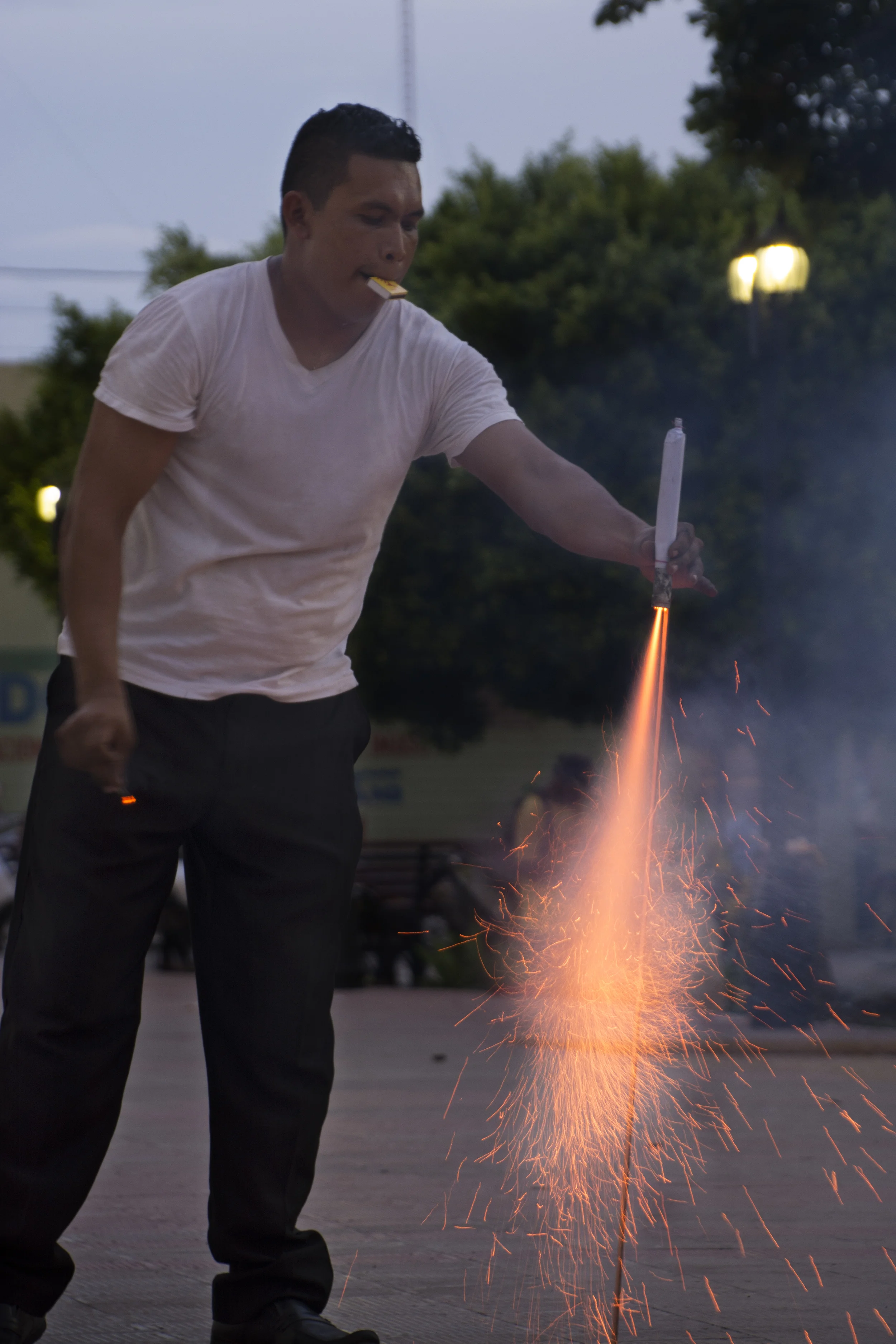 The ultimate rebel, this guy is breaking all the rules. He is holding in his bare hands a really big cylinder of gunpowder wrapped in a piece of paper, and it's on fire. And he has a box of matches in his mouth, a mere foot or two from the gunpowder, which, to reiterate, is on fire. And in his other hand is a burning match. So, in sum, something is on fire in each of his hands, and he has a small bomb in his mouth. And I am sitting a few feet from him taking pictures, so there are two people in this story who are stupid.