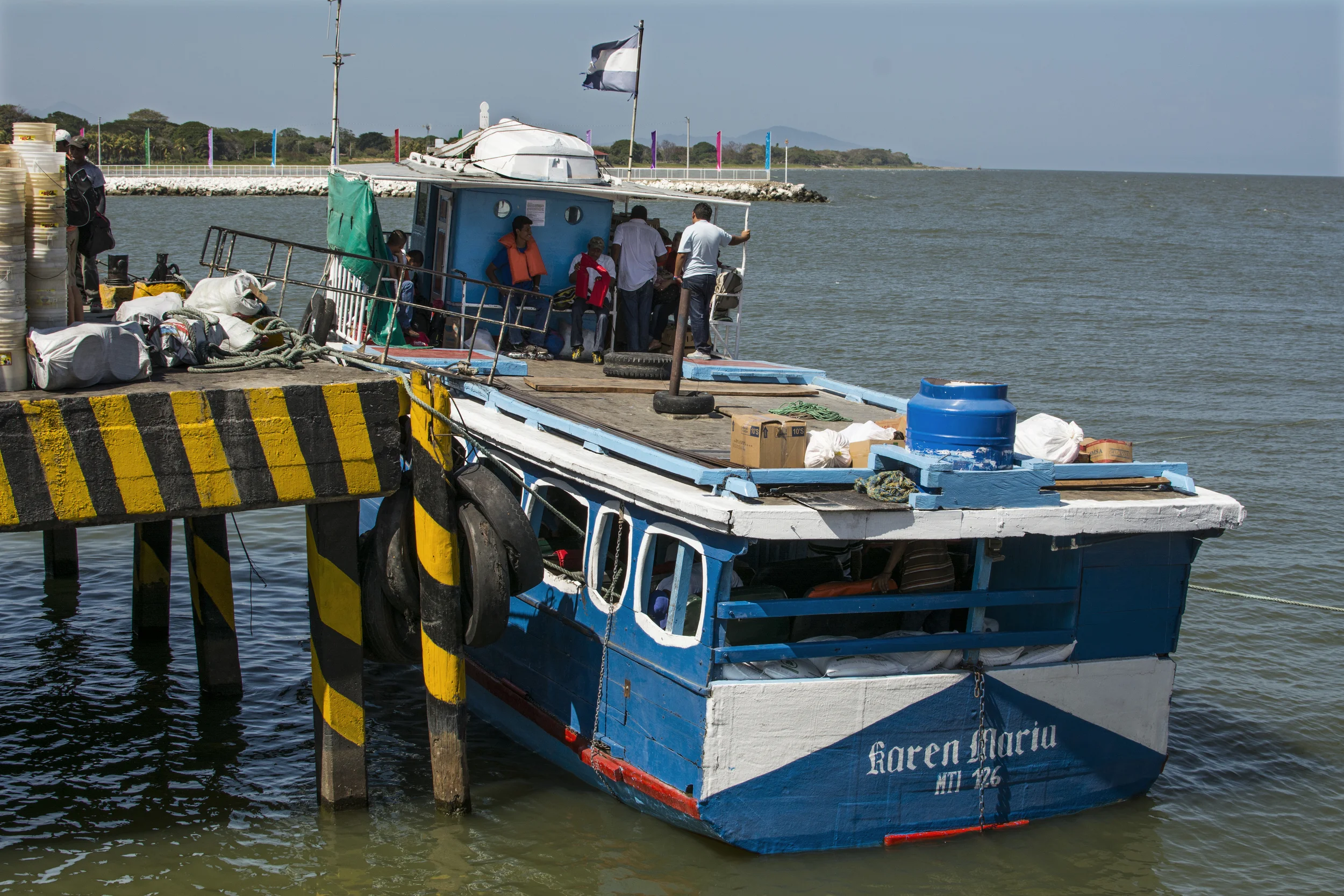 This is the Karen Maria. That blue cylinder on the roof was filled with shark chum that you can throw into the water if the boat comes under attack by bull sharks. The chum distracts them. It is a little known fact that bull sharks abound in Lake Nicaragua. Bull sharks only do two things: eat your children and swim around thinking about eating your children. I read that in 3-2-1 Contact when I was little.