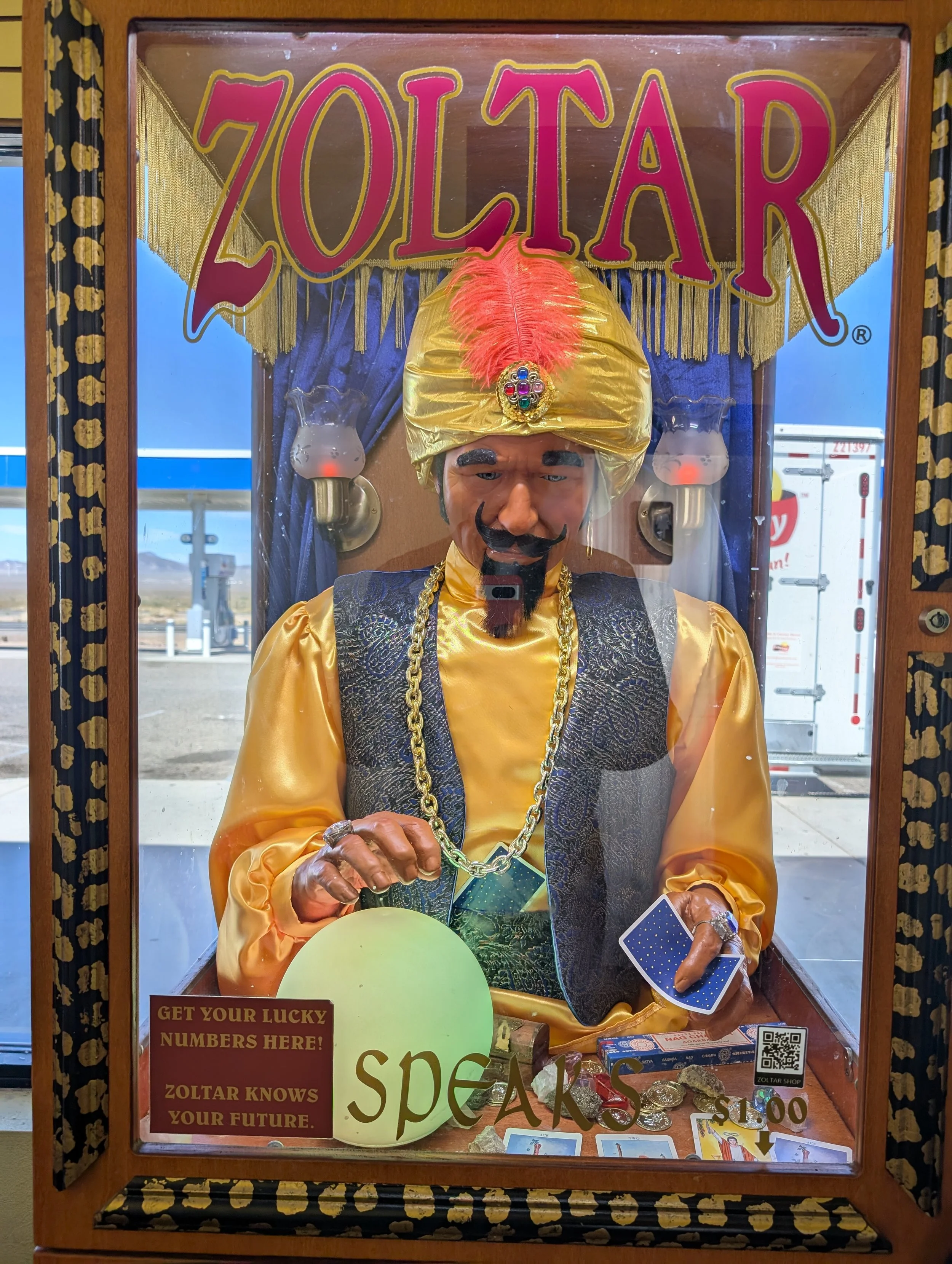 There’s only one gas station between Hoover Dam and Kingman, Arizona. Here is a sample of its inventory: gasoline of various octanes, anorexic hot dogs, melty candy bars, colorful gum, obligatory beer, canned tea, soda pop, salt with a light dusting of nuts sprinkled in, energy drinks, jerky, processed cheese, coffee, Krispy Creme donuts, lesser donuts that lack a reason to exist in the shadow of Krispy Creme, an entire section of delicious Hostess products, pickles that could be either real or plastic I’m not sure, pouches of air that also contain 11 potato chips per package, premade sandwiches that I can charitably say look like bird poop, and the fortune telling game Zoltar, which in the 1988 movie Big granted a young boy his wish to be a grown up.